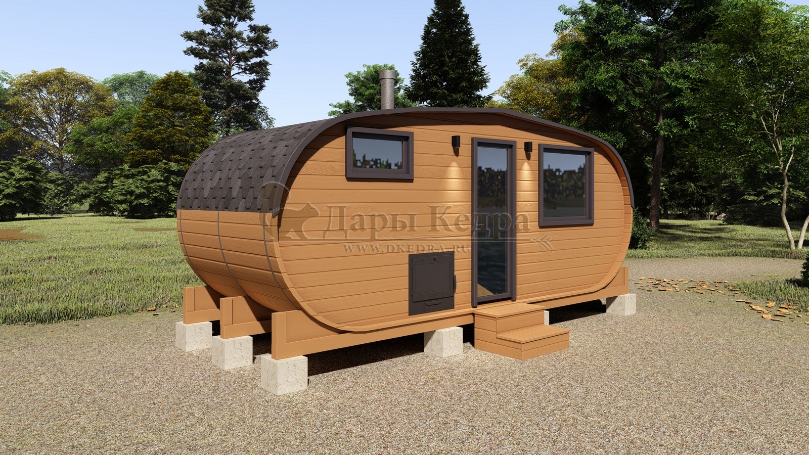 Каждая баня-бочка поставляется в полной комплектации "под ключ", включая печь, дымоход, электрику, бак для воды и мягкую кровлю. Благодаря мобильности конструкции, установка не требует капитального фундамента — достаточно ровной площадки или бетонных блоков.