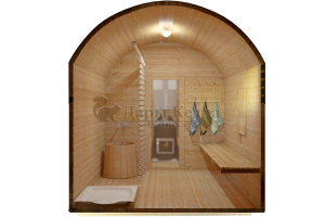 Баня-буханка более просторная за счет увеличенной высоты потолков и ровного пола. Козырек не только украшает баню, но и защищает оставленную обувь от дождя. Лавочки из кедра находятся по всей длине бани-бочки с обеих сторон. Печь расположена в парилке около дальней стены. Время растопки такой бани не превышает 30 минут. В зависимости от выбранного размера баня-бочка буханка с козырьком имеет следующую комплектацию: