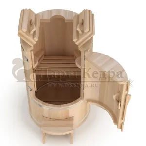 Круглая фитобочка представляет собой мини парную, которую можно использовать не только в спа-салонах, но и дома. Бочка изготовлена из древесины кедра без отбора по сучкам, поэтому такая модель считается более доступной. Фитобочка оборудована откидными створками, дверцей и отверстием для головы. Во время парения человек сидит внутри кедровой бочки, а голова находится снаружи. Благодаря этому исключается возможность перегрева. Подлокотники из кедра, встроенные ручки на створках и двери делают эксплуатацию более удобной.