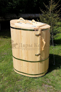 Готовый комплект - это полностью укомплектованный набор с фитобочкой для процедур парения. Овальная модель более просторна и удобна в использовании. Толщина стенок составляет 40-45 мм, что позволяет увеличить срок службы изделия. Верхний скос делает положение головы более комфортным и улучшает обзор. Фитобочка оборудована откидными створками, дверцей и отверстием для головы. Во время парения человек сидит внутри кедровой бочки, а голова находится снаружи. Благодаря этому исключается возможность перегрева. Подлокотники из кедра, встроенные ручки на створках и двери делают эксплуатацию более удобной.