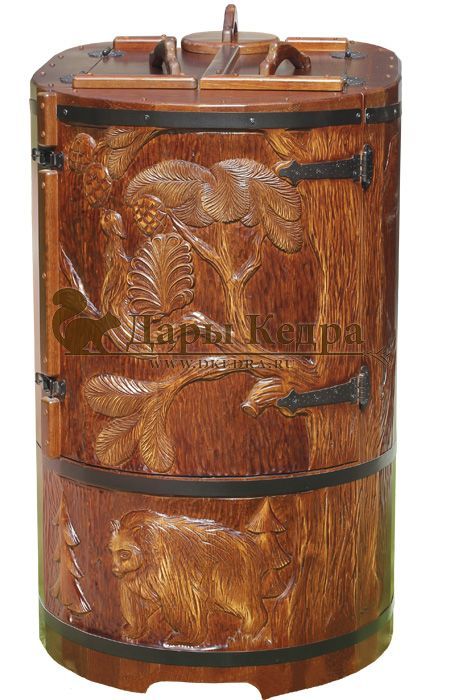 • Кедровая бочка (фитобочка) «Дикий лес» Любая модель эксклюзивной фитобочки - это выбор не только дизайнеров и ценителей красоты, но и тех, кто любит нестандартный подход в любых деталях. С оригинальной авторской фитобочкой Дары Кедра ваша квартира, дом или салон красоты станут объектом всеобщего внимания, ведь такая фитобочка - это не просто смело, красиво и достойно, это еще и очень полезно для Вашего здоровья! Художественная резьба это ручная работа, выполняется разными мастерами и каждый рисунок неповторим. Вы можете выбрать предложенные варианты резьбы или подобрать изображение и мы предложим вам подходящий эскиз. На сайте представлены наши работы в качестве примера. Каждая резьба рассчитывается индивидуально и может быть нанесена на любую модель фитобочки. Эксклюзивная фитобочка может быть представлена в разной цветовой гамме: После того, как цвет фитобочки выбран, необходимо определиться с вариантом резьбы (или предложить свой): Фитобочку можно также декорировать канатной веревкой в места обручей из нержавеющей стали (оплачивается дополнительно).