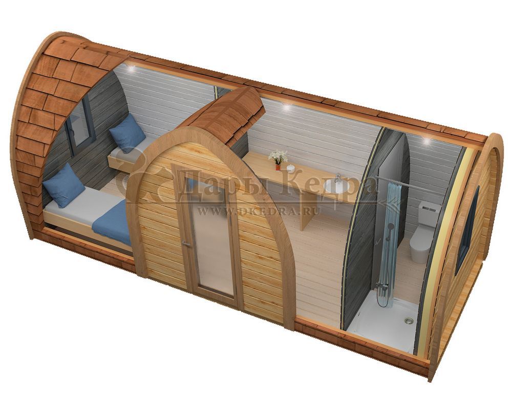 Кемпинг дом «Дуэт+» с боковым входом Такой кемпинг дом удобное и практичное решение для дачного использования или обустройства загородных баз отдыха. Увеличенные размеры и боковой вход со стеклянной дверью позволяют зонировать внутреннее пространство помещения. Домик включает в себя: Жилую зону с кроватями, столиком, вешалкой и полкой; Санузел с сантехникой, душевой поддоном и душевую стойку; Кемпинг дом изготовлен из хвойных пород древесины. Кровля из мягкой черепицы обеспечивают защиту от осадков.