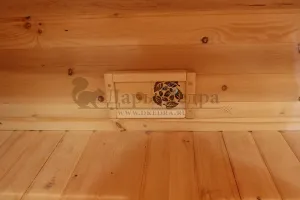 Окна из закаленного стекла (панорамное), можно разместить, как в парилке, так и в комнате отдыха. Может быть установлено только на торцевых (ровных) стенах бани. За дополнительную плату возможно сделать стекло бронзированным.