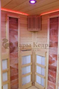 Это специально оборудованная кедровая кабина для прогрева тела человека сухим теплом. Воздух в таких парных не нагревается. Инфракрасные лучи воздействуют на тело, равномерно прогревая мышцы, суставы и органы. Керамические излучатели похожи на лампы, имеют высокую температуру нагрева, поэтому защищены противоожоговыми решетками. Тело человека в таких саунах нагревается интенсивнее. Работает кабина за счет электричества. Установка сауны в угол, позволяет рационально использовать пространство помещения. Подходит как для домашнего использования, так и для коммерции.